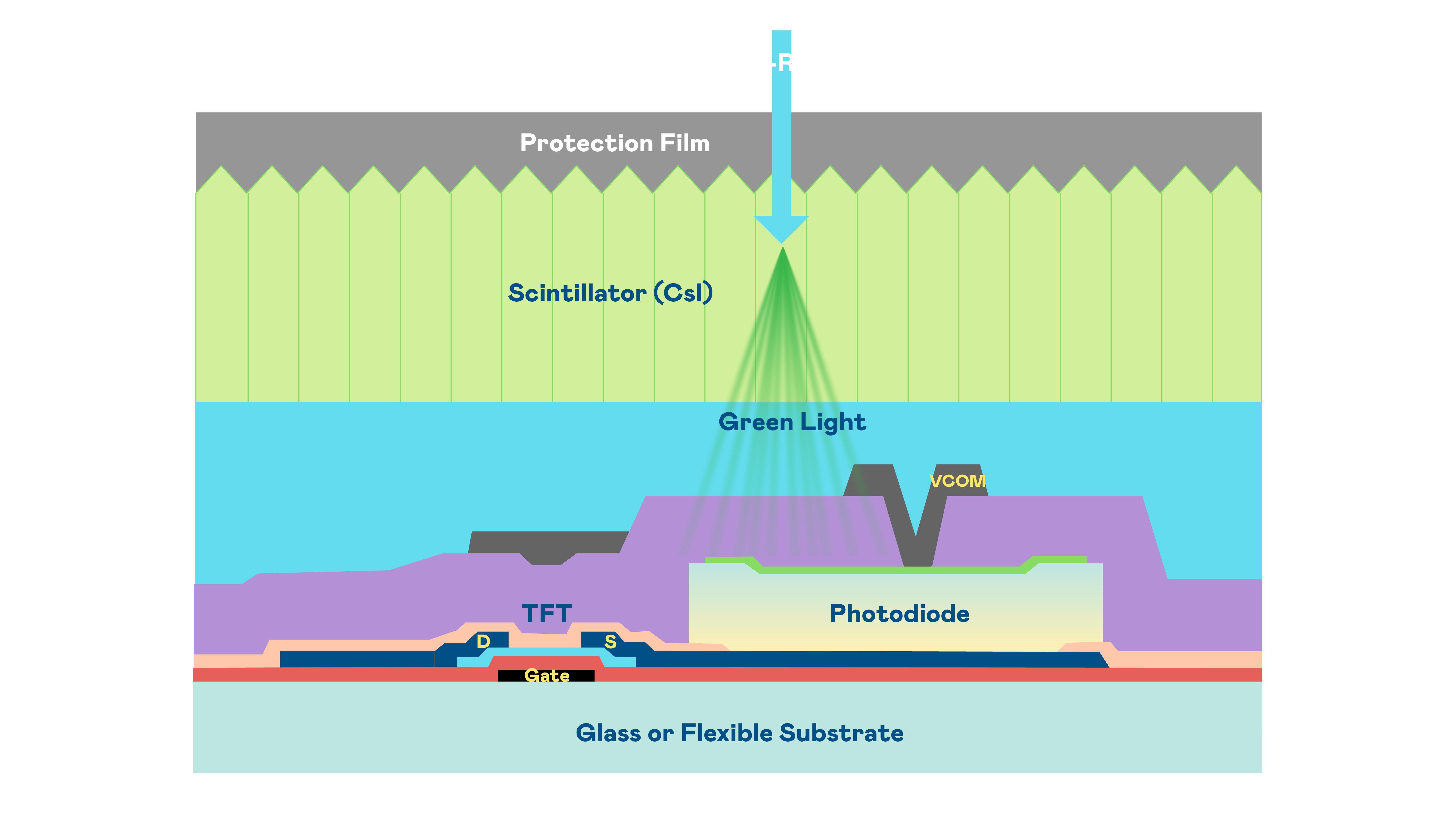 太阳集团城娱8722的X光影像感測陣列使用薄膜電晶體 (TFT) 作為每個像素的讀取開關,搭配光電二極體(Photodiode)的光電轉換元件,用以感測X光影像訊號。